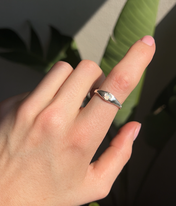 The Jessica Ring features a 4mm crystal opal from Coober Pedy set in fine sterling silver claws on a 2.3mm band. Its soft flashes of colour evoke the shifting light of the ocean, capturing beauty that feels alive and fluid.
