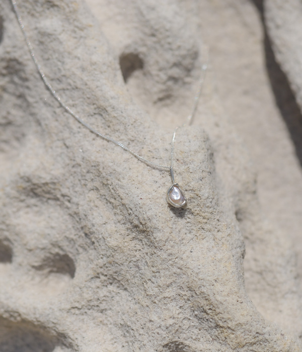 The Penny Necklace features a radiant Keshi pearl suspended on a delicate sterling silver chain, celebrating the gentle shimmer and irregular grace of the ocean. Each pearl is one of a kind, reflecting light in its own quiet way.